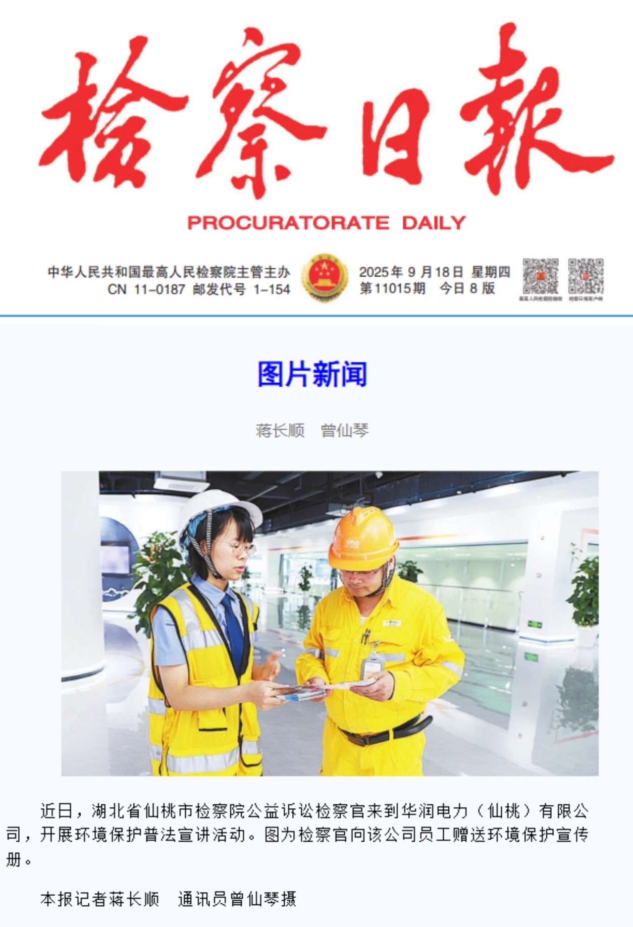 近日,湖北省仙桃市检察院公益诉讼检察官来到华润电力(仙桃)有限公司,开展环境保护普法宣讲活动。图为检察官向该公司员工赠送环境保护宣传册。
